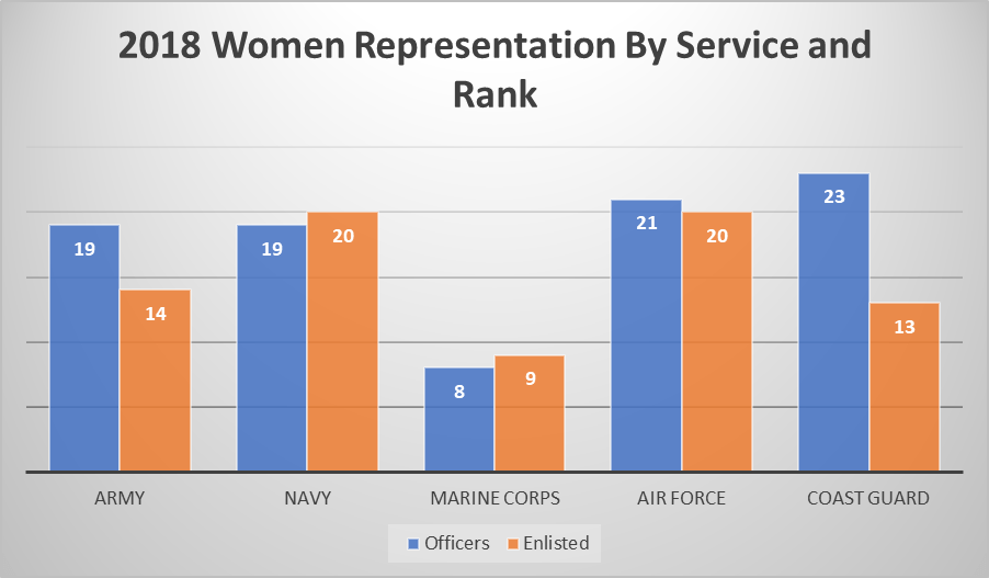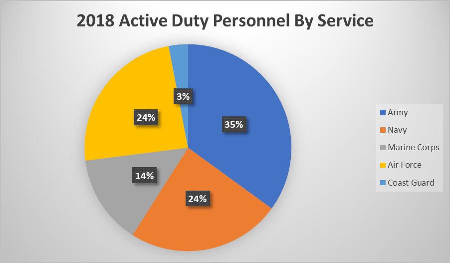 In 2018, there were 1.3 million active service military professionals, which represents .5% of the United States population1. Women represented 16% of the enlisted forces and 19% of the officer corps1. The pie chart below shows the breakdown of the service members by the military branch.